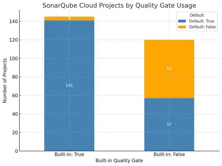 We found that 75% of the projects relied on the organization’s default quality gate. Of these, 55% used SonarQube’s built‑in “Sonar way” while only 45% customized their gates. Interstingly, the built‑in quality gate conditions for security appeared in 91% of projects